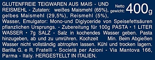 Zutaten: Maismehl, Reismehl, Mono- und Diglyceride. Enthält keine Weizenbestandteile. In glutenfreiem Betrieb hergestelltHersteller: BarillaInhalt: 400g