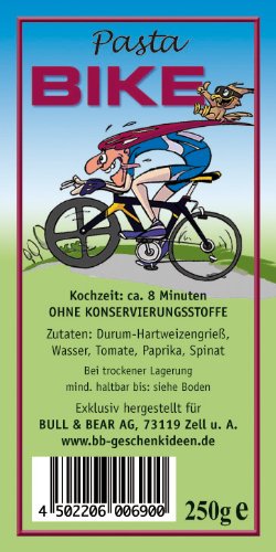 Diese bunten Nudeln in Form von lustigen Fahrrädern sind ein ideales Geschenk für Rennradler, Mountain-Biker, Hobby-Radler und alle, die gern mit dem Zweirad unterwegs sind. Ganz ohne künstliche Farb- oder Zusatzstoffe sind die bunten Nudeln aus 100% Durum-Hartweizengrieß mit Auszügen aus Spinat, Tomate, Paprika, Karotte, rote Beete eine leckere Überraschung. Inhalt 250g