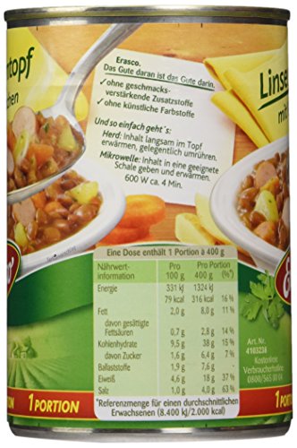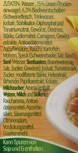 Inhaltsstoffe / Zutaten: Wasser, 30% Linsen, 7% Bockwurstscheiben (Schweinefleisch, Trinkwasser, Jodsalz, Stabilisator: Diphosphat, Trinatriumcitrat, Gewürze, Dextrose, Geliermittel Carrageen, Antioxidationsmittel: Ascorbinsäure, Rauch), Kartoffeln, Möhren, Speck (Schweinebacke, Salz, Rauch), SENF (Wasser, SENFSAATEN, Branntweinessig, Salz, Zucker, Gewürze), Jodsalz, Zucker, Tomatenmark, modifizierte Stärke, Hefeextrakt, Kräuter, Verdickungsmittel: Guarkernmehl, Antioxidationsmittel: Ascorbinsäure, färbender Paprikaextrakt, Aroma, MILCHZUCKER, Säuerungsmittel: Citronensäure, Raucharoma; 1.1. Gebrauchsanweisung: Und so einfach geht's: Herd: Inhalt langsam im Topf erwärmen, gelegentlich umrühren. Mikrowelle: Inhalt in eine geeignete Schale geben und erwärmen. 600 W ca. 4 Min.;