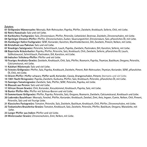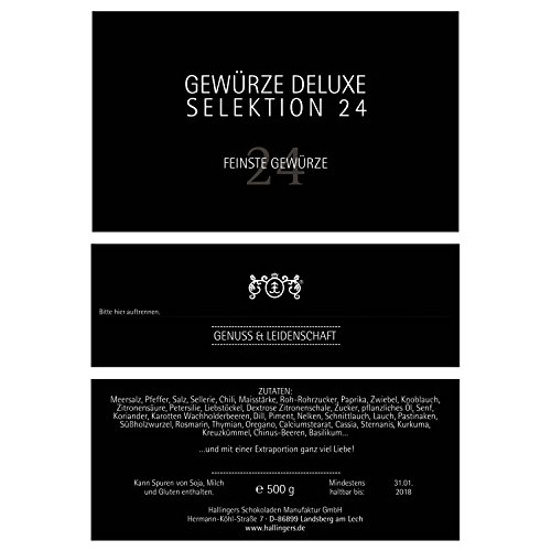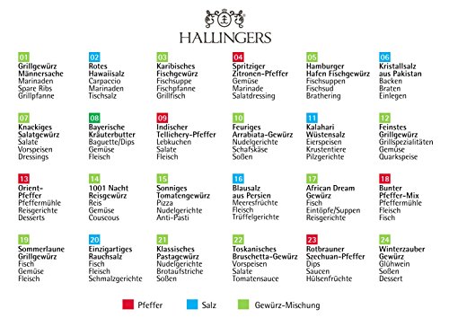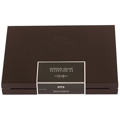 24 exklusive Gewürz-Genüsse in stilvollem Design. Diese stilvolle Gewürze-Deluxebox überrascht mit 24 Variationen aus Salzen, Pfeffern und Gewürzmischungen, die Sie als Kenner und Genießer erfreuen werden. Hinter jedem Deckelchen verbirgt sich ein Topfgläschen (30 ml Volumen) mit von Hand in unserer Manufaktur abgefülltem, erlesenem Gewürz. Außerdem erhalten Sie ein Kärtchen mit Informationen zu Inhalten aller Gewürze. Passt zu jeder Jahreszeit (im Sommer ist z.B. unser Grillgewürz Männersache sehr beliebt, oder unser Rauchsalz). Die Gläschen können bei Bedarf wieder befüllt werden – somit haben Sie das ganze Jahr Freude daran. Die Deluxebox wurde komplett in Bayern gefertigt und ist in limitierten Mengen verfügbar. Viel Freude beim Genießen oder Verschenken! | HALLINGERS – EINE GRÜNDUNG AUS LEIDENSCHAFT: Seit 2012 produzieren wir in unserer Manufaktur mit großer Leidenschaft unsere Genüsse. Alles wird von Hand aus hochwertigen, wo möglich regionalen, Zutaten hergestellt. Unsere Produktverpackungen sind modern und innovativ. Wir durften schon einige nationale und internationale Auszeichnungen gewinnen. In unserem Familienunternehmen ist uns eine positive Unternehmenskultur genauso wichtig wie unser soziales Engagement. Besuchen Sie uns und lassen Sie sich von unserer Leidenschaft geflügeln! Ihre Karin und Patrick Hallinger (Gründer und Geschäftsführer)