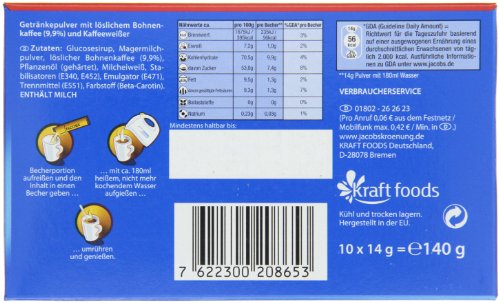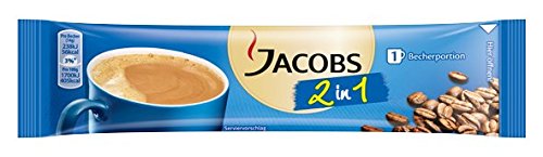Jacobs 2in1 löslicher Kaffee, Instantkaffee, 10 Becherportionen:Für alle Kaffeeliebhaber, die viel unterwegs sind und dabei nicht auf eine gute Tasse Kaffee verzichten wollen, gibt es nun Jacobs 2in1. Das ist löslicher Bohnenkaffee mit Kaffeeweißer in einer praktischen Becherportionen. Einfach mit heißem Wasser aufgießen, umrühren und fertig. Ob am Arbeitsplatz, in der Uni, unterwegs oder zu Hause – für die Jacobs 2in1 Becherportionen ist in jeder Tasche Platz. Die praktischen Becherportionen halten das Aroma bis zum Kaffeegenuss geschützt – auch unterwegs! Inhalt: Löslicher Kaffee mit Kaffeeweißer , Zutaten:JAC013: Glucosesirup, Magermilchpulver, löslicher Bohnenkaffee (9,9%), Kokosfett (ganz gehärtet), Milcheiweiß, Stabilisatoren (E340, E452), Emulgator (E471, E481), Trennmittel (E551), Farbstoff: Beta-Carotin Allergikerhinweis: Enthält Milch. , Lieferumfang:12 x 1 Packung Jacobs 2in1 mit 10 Becherportionen Nettogewicht: 140g / Packung, 14g / Becherportion