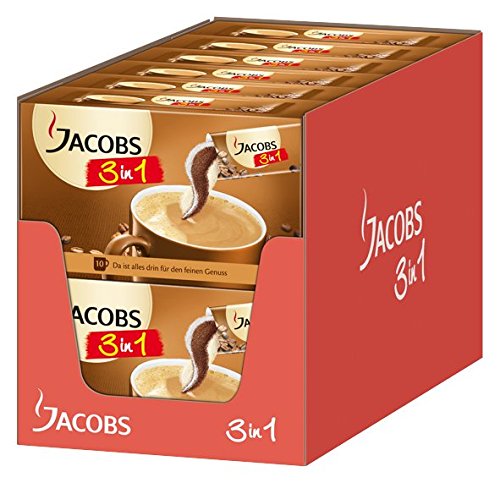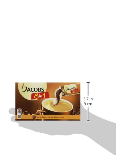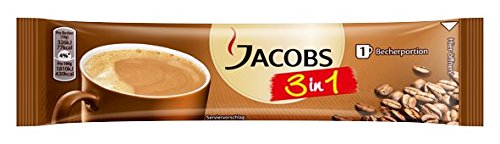 Jacobs 3in1 löslicher Kaffee, Instantkaffee, 10 Becherportionen:Für alle Kaffeeliebhaber, die viel unterwegs sind und dabei nicht auf eine gute Tasse Kaffee verzichten wollen, gibt es nun Jacobs 3in1. Das ist löslicher Bohnenkaffee mit Kaffeeweißer und Zucker in einer praktischen Becherportionen. Einfach mit heißem Wasser aufgießen, umrühren und fertig. Ob am Arbeitsplatz, in der Uni, unterwegs oder zu Hause – für die Jacobs 3in1 Becherportionen ist in jeder Tasche Platz. Die praktischen Becherportionen halten das Aroma bis zum Kaffeegenuss geschützt – auch unterwegs! Inhalt: Löslicher Kaffee mit Kaffeeweißer und Zucker , Zutaten:JAC012: Zucker (54%), Glucosesirup, Kokosfett (gehärtet), löslicher Bohnenkaffee (8%), Stabilisatoren (E340, E452), Milcheiweiß, Emulgator (E471, E481), Trennmittel (E551) Allergikerhinweis:Enthält Milch. , Lieferumfang:12 x 1 Packung Jacobs 3in1 mit 10 Becherportionen Nettogewicht: 180g / Packung, 18g / Becherportion