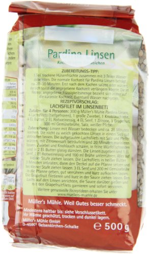 Müller's Mühle – Pardina Linsen; 1.1. (nur 30 Minuten Kochen ohne Einweichen); 1.2. Inhaltsstoffe / Zutaten: Pardina Linsen;