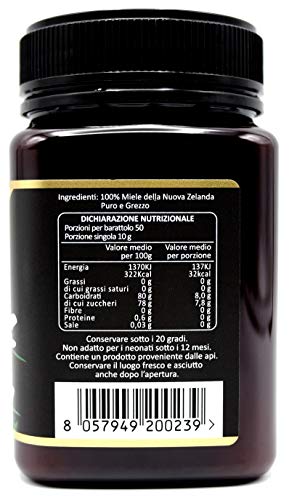 Manuka-Honig 500+ MGO 500g. Hergestellt in Neuseeland, Aktiver und unbehandelter, rein und natürlich. Von akkreditierten Laboratorien getestetes Methylglyoxal. NaturalePiù