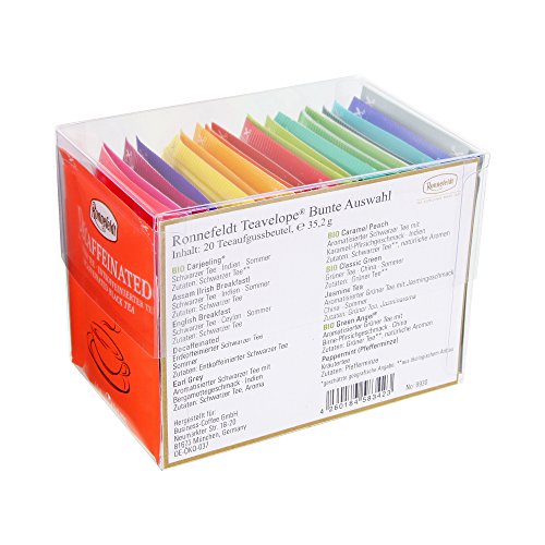 Ronnefeldt Teebeutel Probierset „Bunte Auswahl“ mit 20 verschiedenen Sorten zum Entdecken: Ronnefeldt Tee steht für exklusiven Tee in erstklassiger Qualität. Bereits seit 1823 ist das Familienunternehmen aus Frankfurt am Main dem Tee verschrieben, und bietet Teeliebhabern verschiedene Teemischungen von höchster Güte. Teavelope® ist der Teeaufgussbeutel im Aromasafe, gut geschützt in einem Sachet aus umweltfreundlicher Polypropylenfolie. DE-ÖKO-037