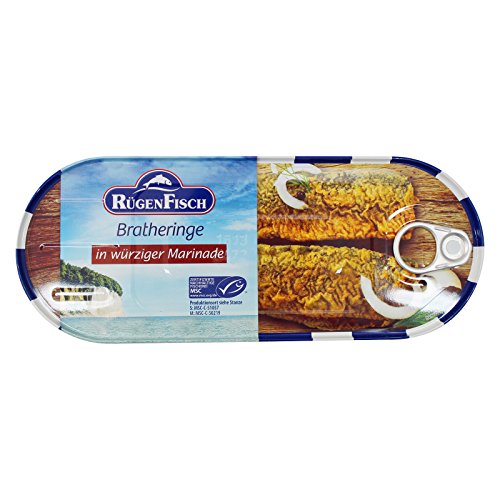 Eine Dose Brathering in würziger Marinade von Rügen Fisch beinhaltet ca. 500 g (Fischabtropfgewicht: ca. 300 g). Sie erhalten ein 12er Pack. Öffnen Sie die Dose und schon kommt Ihnen ein Stück Atlantik entgegen. Die Rückengräte lässt sich mühelos entfernen. In Verbindung mit der herzhaften Marinade sind die zarten Filetstücke ein Hochgenuss. Passend zum Bratfisch können Sie Kartoffelmus, Reis oder Brot servieren.Hauptfanggebiet: Nordostatlantik (FAO 27)Subfanggebiet: NordseeFangmethode: pelagisches Schleppnetz oder RingwadeZutaten: Heringe (ohne Schwanz) (Clupea harengus), Trinkwasser, Zwiebeln, Weizenmehl, Branntweinessig, Zucker, Rapsäl, Tomatenmark, Speisesalz, Wacholderbeeren, hydrolysiertes Pflanzeneiweiß (Raps, Mais), Säuerungsmittel: Citronensäure; Aromen, Säureregulator: Natriumcitrate; Dextrose. Kann Spuren von Senf, Sellerie, Milch und Gluten enthalten.Fischabtropfgewicht: ca. 300 gDurch Erhitzen haltbar gemacht.Durchschnittliche Nährwerte pro 100 g:Brennwert: 994 kj (238 kcal)Fett: 17,0 g, davon gesättigte Fettsäuren: 3,1 gKohlenhydrate: 5,0 g, davon Zucker: 2,1 gEiweiß: 16,0 gSalz: 1,0 gHersteller: Rügen Fisch AG, Straße der Jugend 10, 18546 SassnitzInhalt: 12 x 500 gin würziger Marinadeherzhaft & leckerpasteurisiertFischabtropfgewicht: je ca. 300 g
