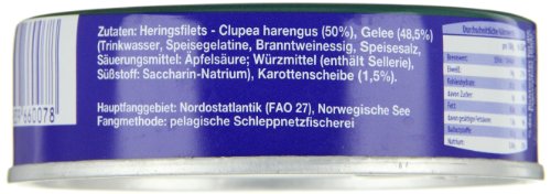 Die Heringsfilets in würzigem Gelee von Rügen Fisch erhalten Sie im 12er Pack. Eine Dose beinhaltet ca. 200 g. Öffnen Sie die Dose und schon kommt Ihnen der köstliche Duft von leckerem Heringsfilet in Aspik entgegen. Für das Produkt werden nur handerlesene und hochqualitative Filets verwendet. Dieses Fischprodukt ist frei von Konservierungsstoffen und mit Brot oder Brötchen ein Höchstgenuss.Hauptfanggebiet: Nordostatlantik (FAO 27), Norwegische SeeFangmethode: pelagische Schleppnetzfischerei / RingwadenZutaten: Heringsfilets (Clupea harengus) (50 %), Gelee (Trinkwasser, Speisegelatine, Branntweinessig, Speisesalz, Säurungsmittel: Äpfelsäure; Maltodextrin, Dextrose, Gewürze, Sojaöl, Aroma, Süßungsmittel: Saccarin-Natrium) (48,5 %), Karottenscheibe (1,5 %)Kann Spuren von Sellerie und Gluten enthalten.Haltbar durch Pasteurisation. Ohne Konservierungsstoffe.Gewichtsverlust durch Erhitzen.Bitte kühl servieren.Durchschnittliche Nährwerte pro 100 g:Brennwert: 559 kj (134 kcal)Fett: 8,8 g, davon gesättigte Fettsäuren: 1,8 gKohlenhydrate: 0,1 g, davon Zucker: 0,0 gEiweiß: 14,0 gSalz: 1,50 gHersteller: Rügen Fisch AG, PF 12, 18540 Sassnitz – Insel RügenInhalt: 12 x 200 gHeringsfiletsin würzigem Geleeohne KonservierungsstoffeOstprodukt