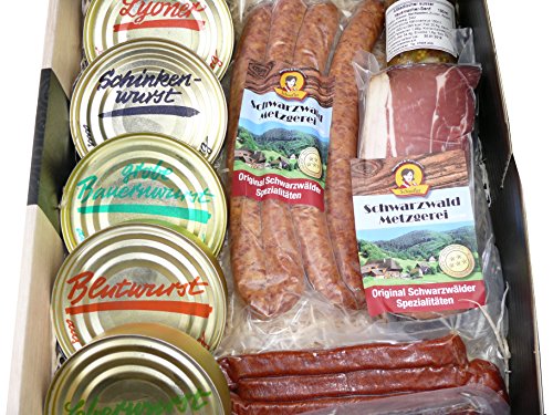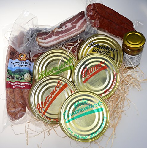 Hier mal ein Geschenk für den Vorratsraum – Dosenwurst Sortiment, Schinken und feine Räucherwurst- Dosenwurst Sortiment mit 5 Dosen à 200g 1 x Lyoner, 1 x Schinkenwurst, 1 x Blutwurst, 1 x Grobe Bratwurst, 1 x Leberwurst – 1 Glas Altbadischer Senf 100g Allergene: Enthält Senf – Schwarzwälder Schinken am Stück 500g – Schwarzwald Speckscheibe 100g – 2 Paar Landjäger – 2 Paar Bauernwürste * gekühlt lagern bei ca. 5 Grad Celsius * Dosen und Senf sind min. 4 Monate haltbar * Würste und Schinken sind min 30 Tage haltbar* Außenmaß des Kartons: 370 x 270 x 100 mm Verschenken Sie Geschenkkörbe aus dem Schwarzwald. Die kommen immer gut an! Hersteller des Senf: Bernhard Wiedemer e.K. Waldstraße 59, 77767 Appenweier