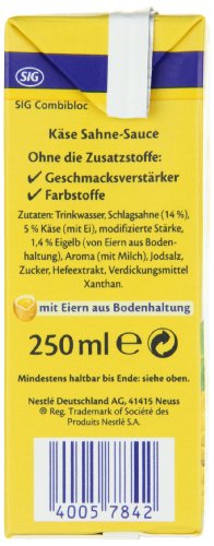 Inhaltsstoffe / Zutaten: ZUTATEN: Trinkwasser, 10% SCHLAGSAHNE, 4.5% KÄSE (mit EI), modifizierte Stärke, 1,5% EIGELB (von EIERN aus Bodenhaltung), Jodsalz, Aromen (mit MILCH), Zucker, Hefeextrakt, Verdickungsmittel Xanthan.; 1.1. BULLETS: + In einem mikrowellengeeigneten Gefäß zugedeckt bei 600 Watt erwärmen. + So einfach zubereitet:#Unter Rühren erwärmen.;